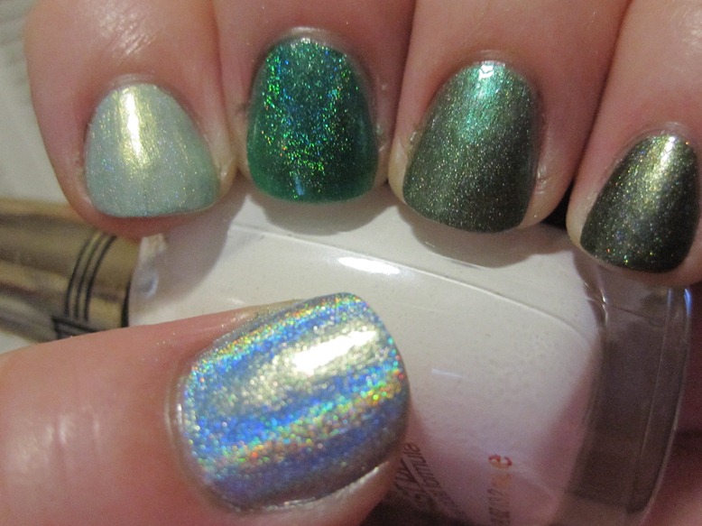 I painted on a dark green holo called Peace, Love, and Polish by Piper Polish, and then dotted in Enkelini The Grass is Greener, a bright green holo.