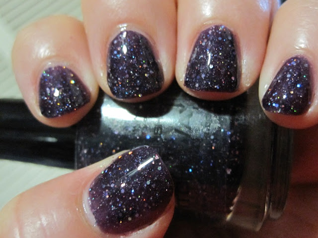 Which Way. This was part of her Halloween collex, I believe, but I'd wear it year 'round. I love a pretty scattered holo, and how different to have it in a dark purple jelly base? The second pix is a little blurred to emphasize the depth of the polish and the sparkly holo. Which Way is a Winner Winner!