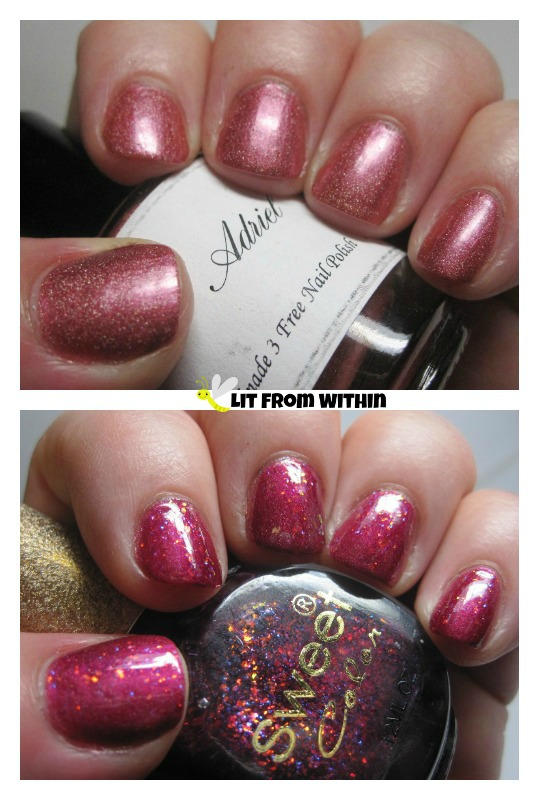 Above The Curve Adriel is a pretty rose pink with a subtle holo, and becomes a juicy raspberry flakie pool with Sweet Color WO12.